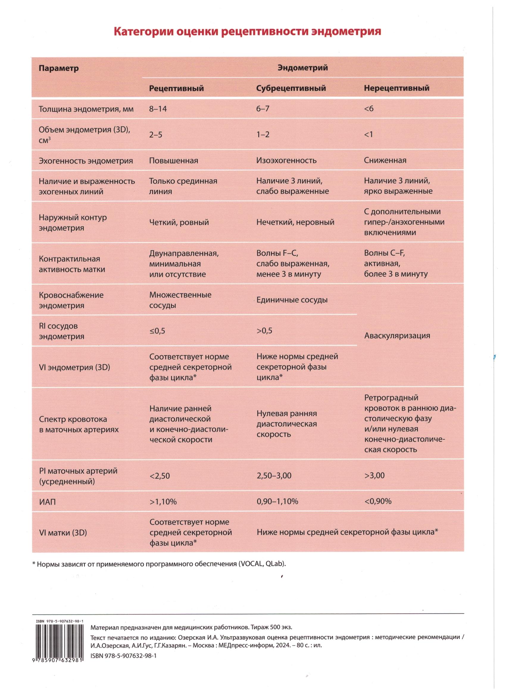 Озерская И.А., Таблица: Категории оценки рецептивности эндометрия