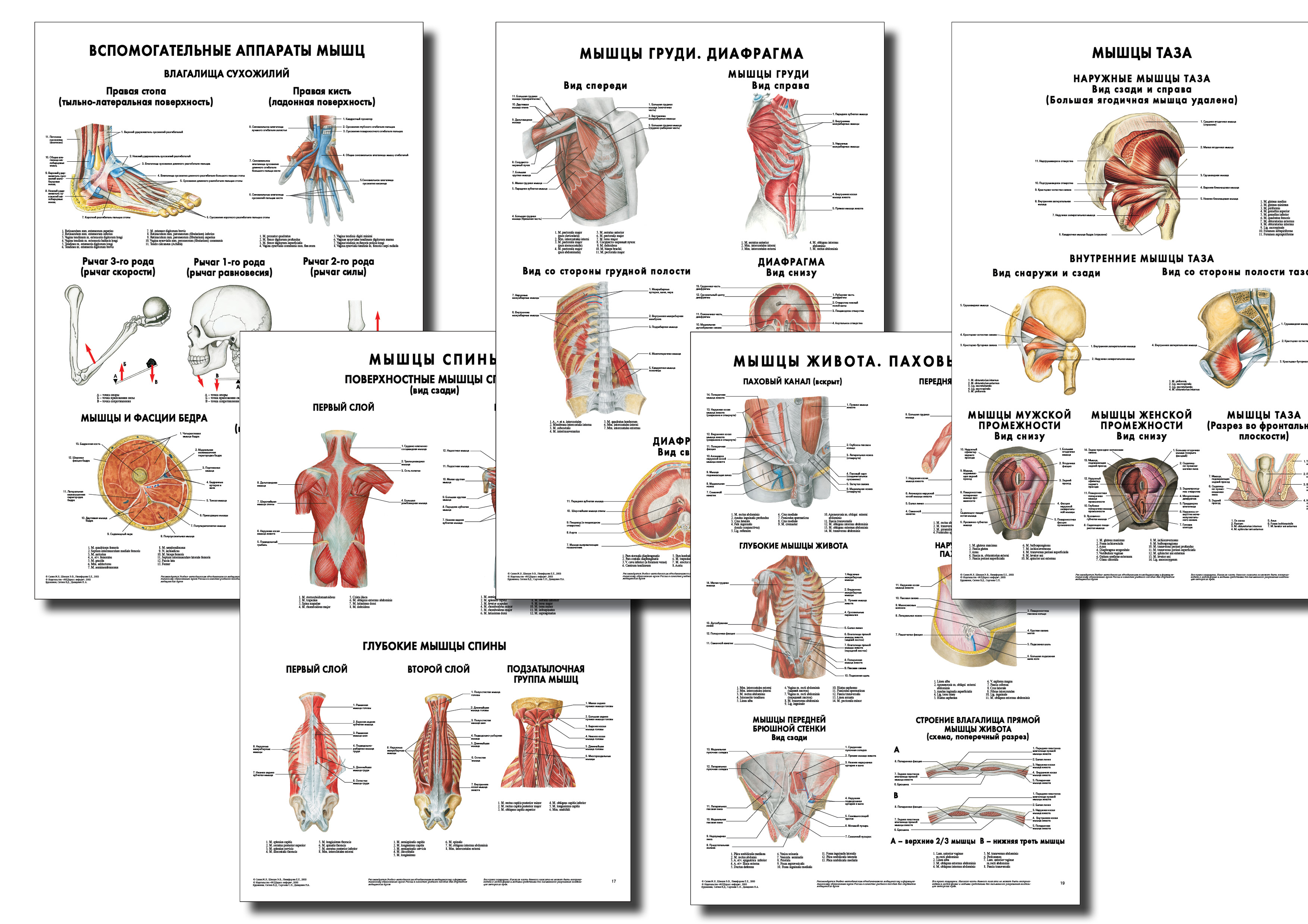 Комплект №4 посвящен вспомогательным аппаратам мышц (сухожильные влагалища, фасции), а также мышцам туловища (мышцам груди, спины, живота, таза, диафрагме). Детальные и наглядные изображения дополнены названиями анатомических образований на русском и латинском языках. Для плакатов были отобраны наиболее информативные и наглядные рисунки из учебника «Анатомия человека» под редакцией М.Р. Сапина.